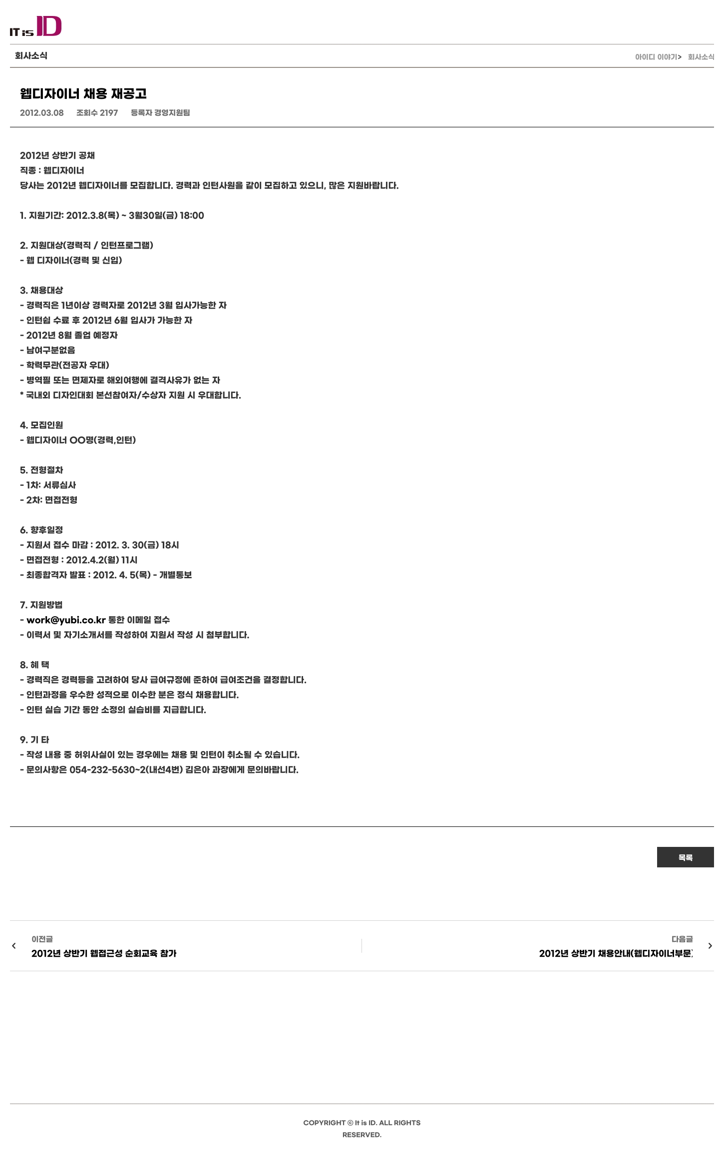 당사는 2012년 웹디자이너를 모집합니다. 경력과 인턴사원을 같이 모집하고 있으니, 많은 지원바랍니다.