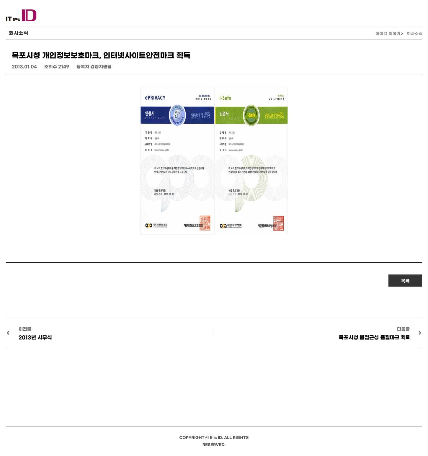 목포시청 개인정보보호마크, 인터넷사이트안전마크 획득