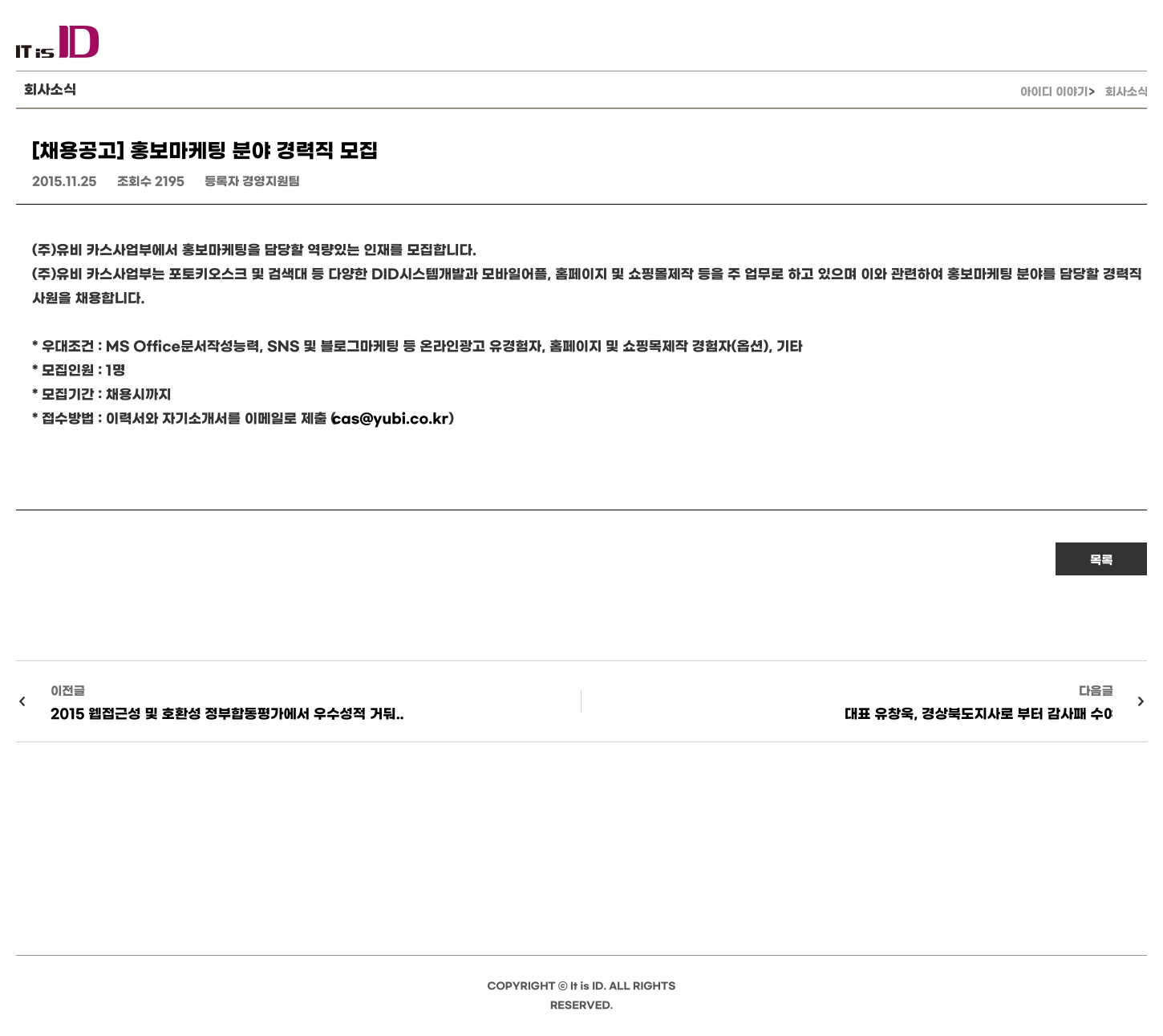 (주)유비 카스사업부는 포토키오스크 및 검색대 등 다양한 DID시스템개발과 모바일어플, 홈페이지 및 쇼핑몰제작 등을 주 업무로 하고 있으며 이와 관련하여 홍보마케팅 분야를 담당할 경력직 사원을 채용합니다.