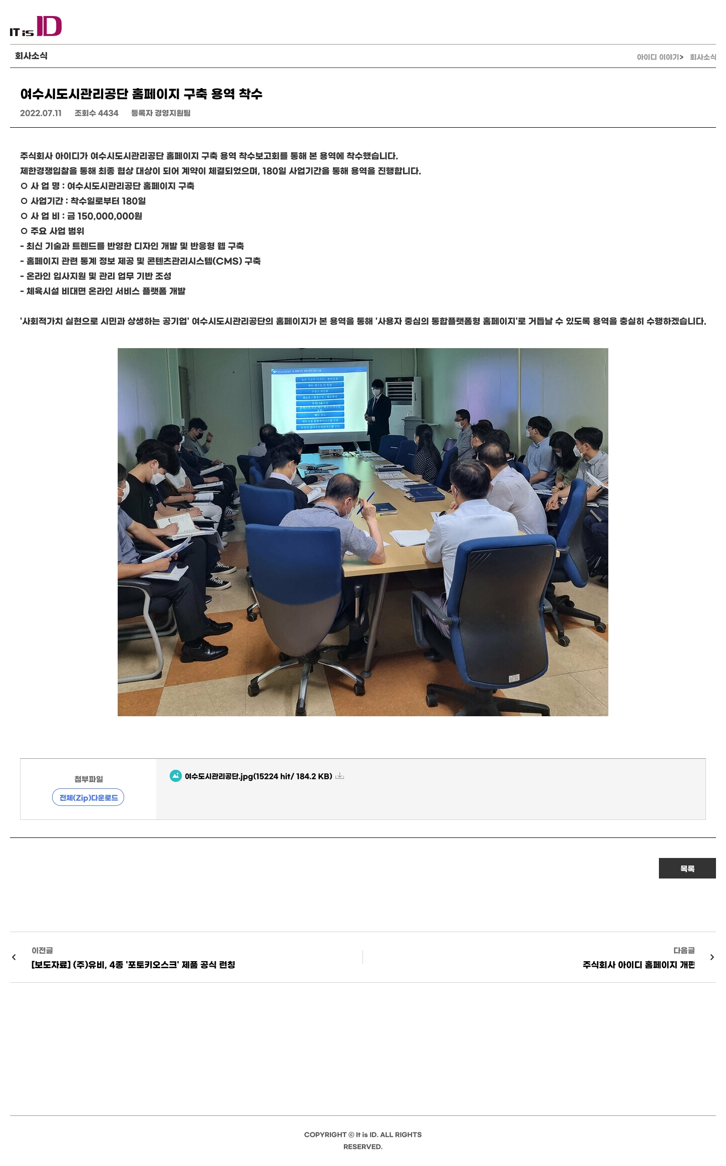 주식회사 아이디가 여수시도시관리공단 홈페이지 구축 용역 착수보고회를 통해 본 용역에 착수했습니다.
