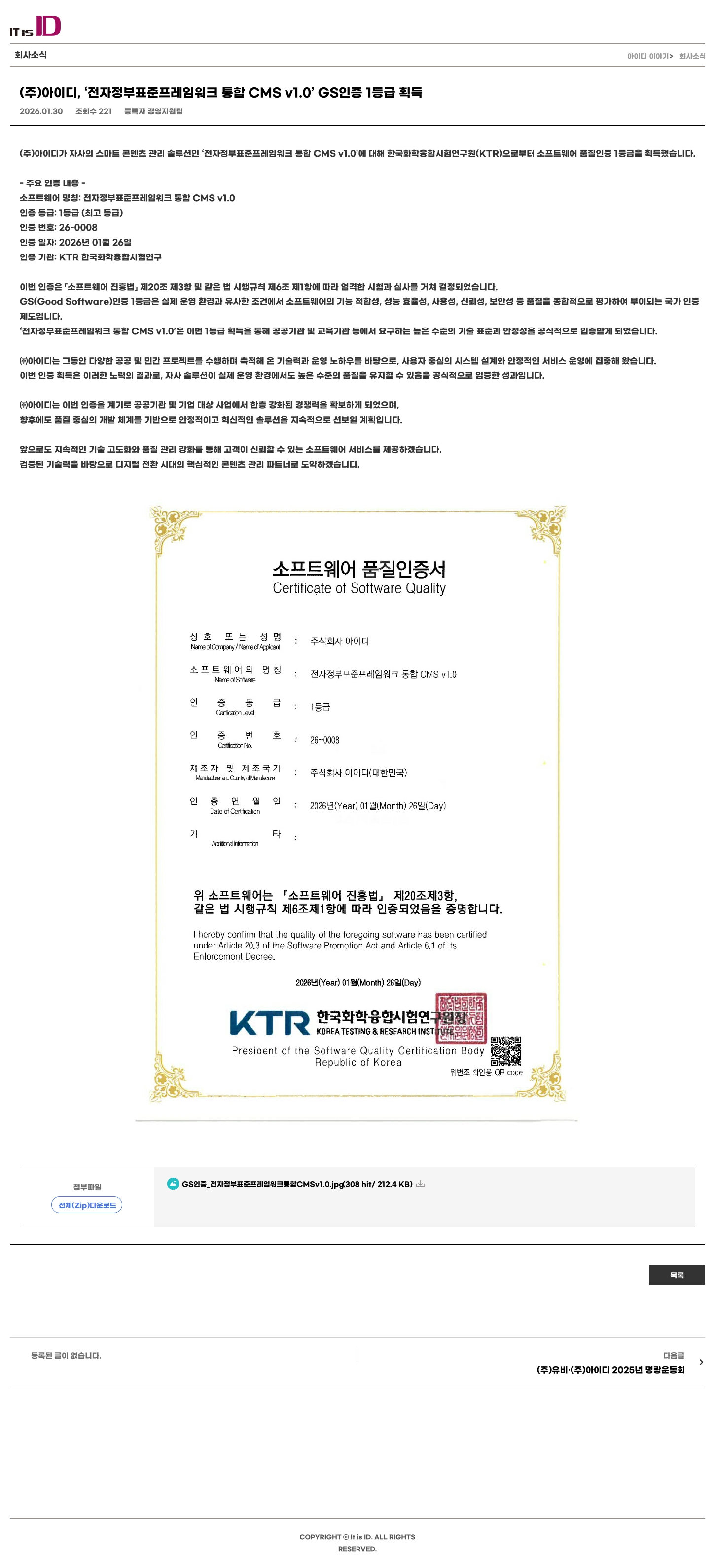 (주)아이디가 자사의 스마트 콘텐츠 관리 솔루션인 ‘전자정부표준프레임워크 통합 CMS v1.0’에 대해 한국화학융합시험연구원(KTR)으로부터 소프트웨어 품질인증 1등급을 획득했습니다.