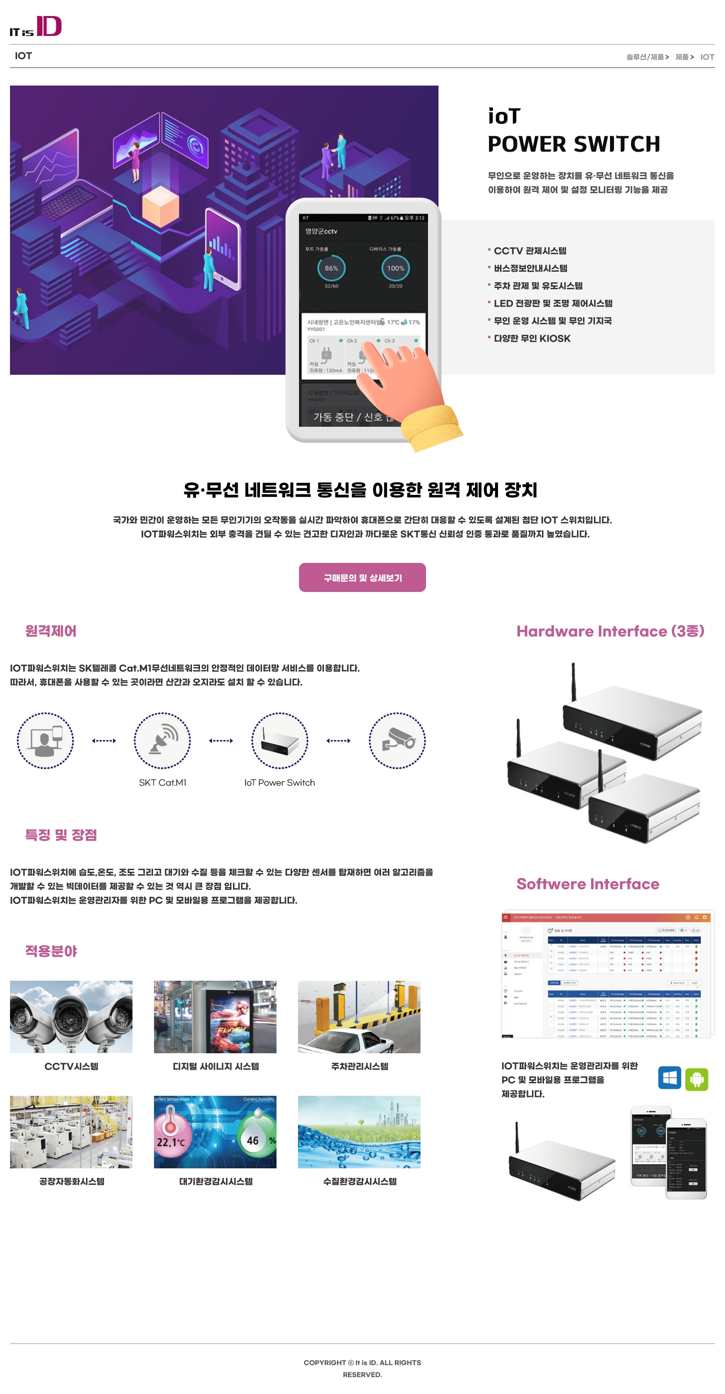 국가와 민간이 운영하는 모든 무인기기의 오작동을 실시간 파악하여 휴대폰으로 간단히 대응할 수 있도록 설계된 첨단 IOT 스위치입니다. IOT파워스위치는 외부 충격을 견딜 수 있는 견고한 디자인과 까다로운 SKT통신 신뢰성 인증 통과로 품질까지 높였습니다.